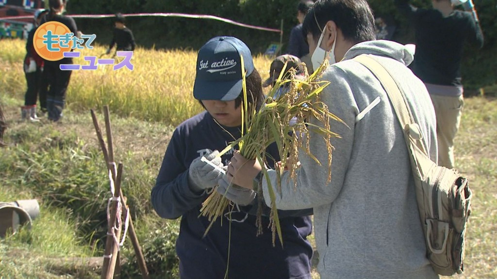 生徒たちは「とても楽しかった。大きく育って嬉しい。」と笑顔で話し、刈り取った稲を稲木掛けしていました。