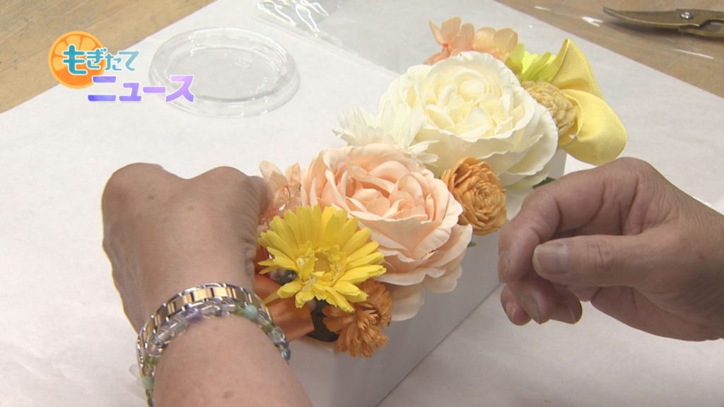 アートフラワー、ドライフラワー、プリザーブドフラワーの3種類を使ったアレンジで、講師の森谷万知子さんから「人と違っていい。ゆっくりと花と向き合う時間を楽しんで」とアドバイスを受け、参加者はリラックスした楽しい時間を過ごしました。