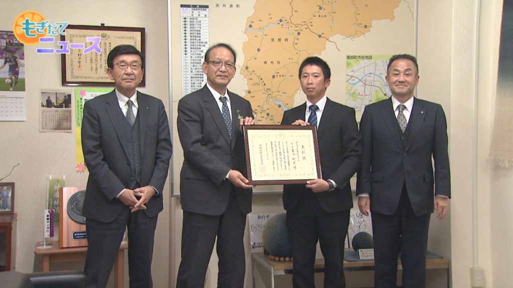 11月24日、園部中学校の廣田剛史教諭が南丹市役所を訪れ、京都府公立学校優秀教職員表彰受賞を報告しました。