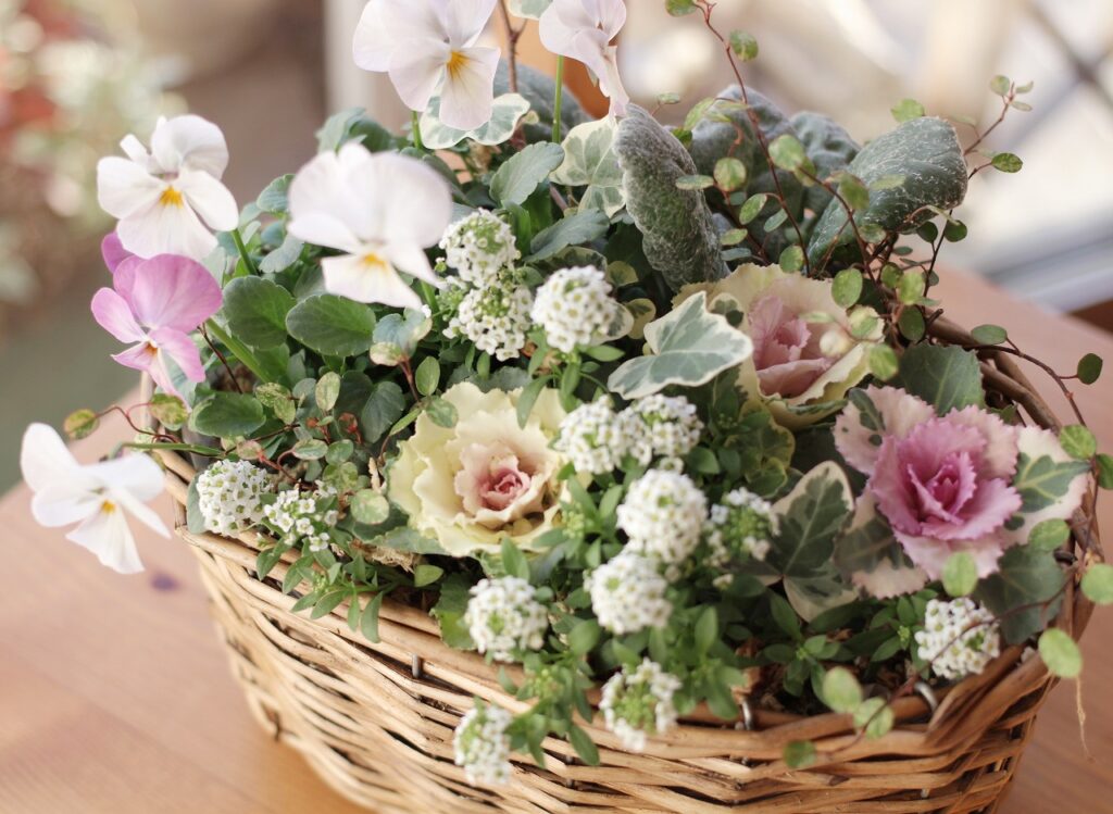 春までたっぷり楽しめるパンジーやビオラ、迎春にぴったりなハボタンなどをバスケットに寄せ植えし、寒い冬の癒しになる花かごを作ります。